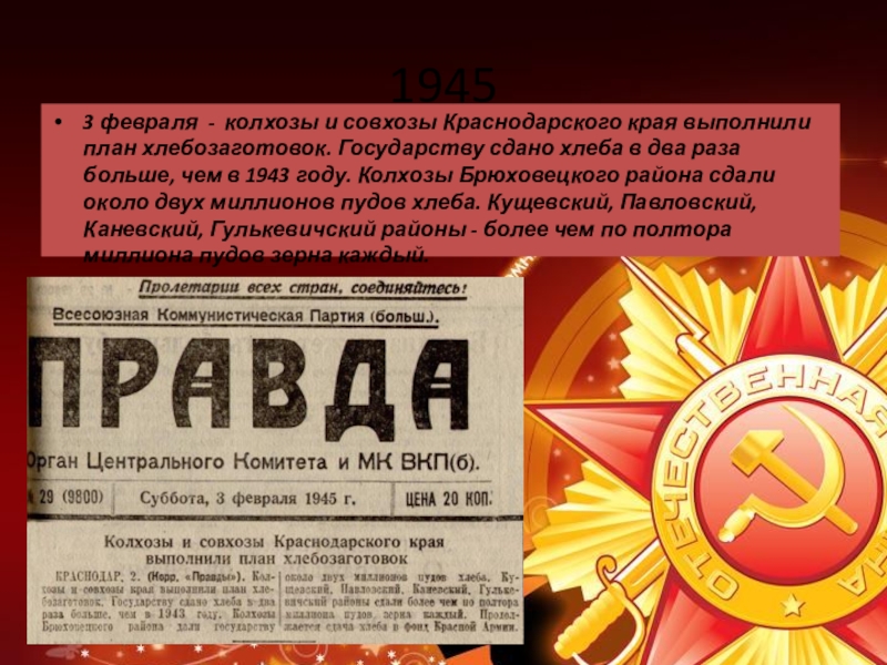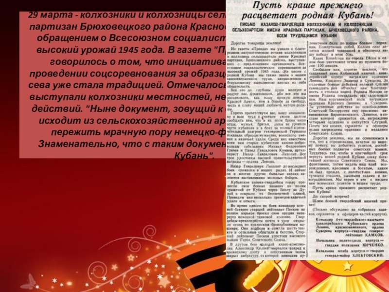 Краснодарского края выступили с обращением о Всесоюзном социалистическом соревновании за высокий урожай 1945 года. В газете "Правда" от 29 марта 1945 г. говорилось о том, что инициатива передовых колхозов о проведении соцсоревнования за образцовое проведение весеннего сева уже стала традицией. Отмечалось, что ранее инициаторами выступали колхозники местностей, не входивших в зону военных действий. "Ныне документ, зовущий к борьбе за высокий урожай, исходит из сельскохозяйственной артели, которой пришлось пережить мрачную пору немецко-фашистской оккупации. Знаменательно, что с таким документом сегодня выступает Кубань".
