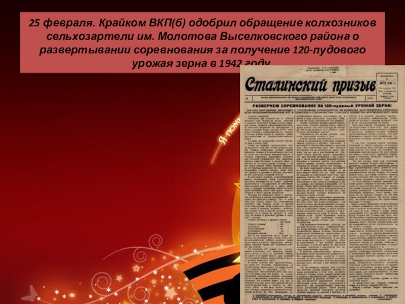 Слайд 1025 февраля. Крайком ВКП(б) одобрил обращение колхозников сельхозартели им. Молотова Выселковского района
