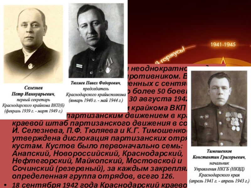 3 сентября. Постановлением крайкома ВКП (б) для руководства партизанским движением в крае создан краевой штаб партизанского движения в составе П.И. Селезнева, П.Ф. Тюляева и К.Г. Тимошенкова и утверждена дислокация партизанских отрядов по кустам. Кустов было первоначально семь: Анапский, Новороссийский, Краснодарский, Нефтегорский, Майкопский, Мостовской и Сочинский (резервный), за каждым закреплялась определенная группа отрядов, всего 126.