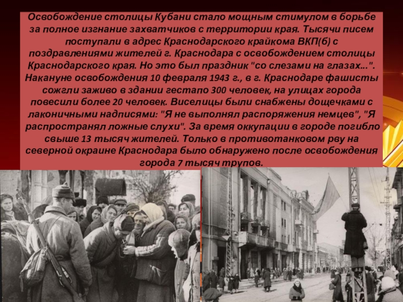 захватчиков с территории края. Тысячи писем поступали в адрес Краснодарского крайкома ВКП(б) с поздравлениями жителей г. Краснодара с освобождением столицы Краснодарского края. Но это был праздник "со слезами на глазах...". Накануне освобождения 10 февраля 1943 г., в г. Краснодаре фашисты сожгли заживо в здании гестапо 300 человек, на улицах города повесили более 20 человек. Виселицы были снабжены дощечками с лаконичными надписями: "Я не выполнял распоряжения немцев", "Я распространял ложные слухи". За время оккупации в городе погибло свыше 13 тысяч жителей. Только в противотанковом рву на северной окраине Краснодара было обнаружено после освобождения города 7 тысяч трупов.