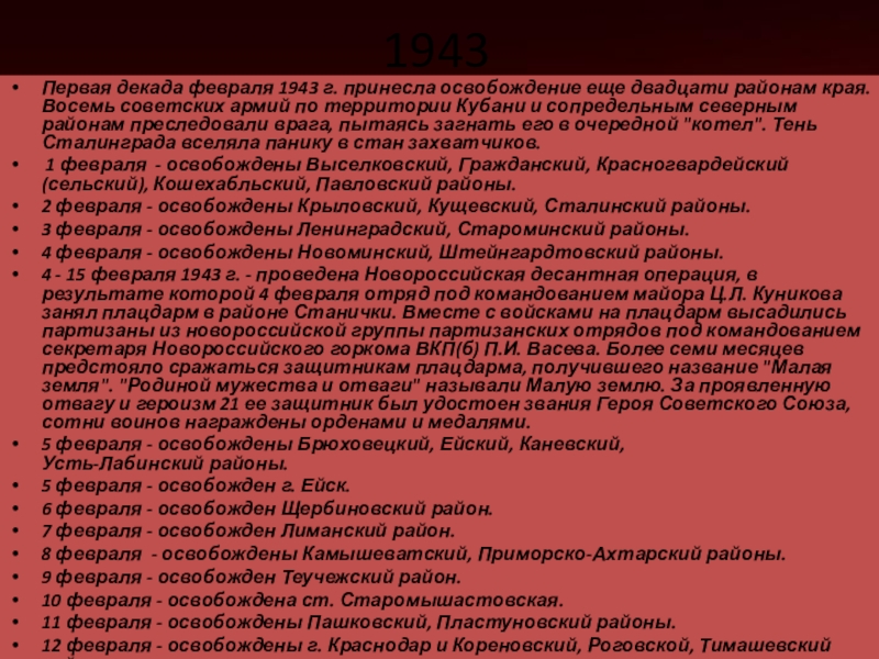 4 - 15 февраля 1943 г. - проведена Новороссийская десантная операция, в результате которой 4 февраля отряд под командованием майора Ц.Л. Куникова занял плацдарм в районе Станички. Вместе с войсками на плацдарм высадились партизаны из новороссийской группы партизанских отрядов под командованием секретаря Новороссийского горкома ВКП(б) П.И. Васева. Более семи месяцев предстояло сражаться защитникам плацдарма, получившего название "Малая земля". "Родиной мужества и отваги" называли Малую землю. За проявленную отвагу и героизм 21 ее защитник был удостоен звания Героя Советского Союза, сотни воинов награждены орденами и медалями.