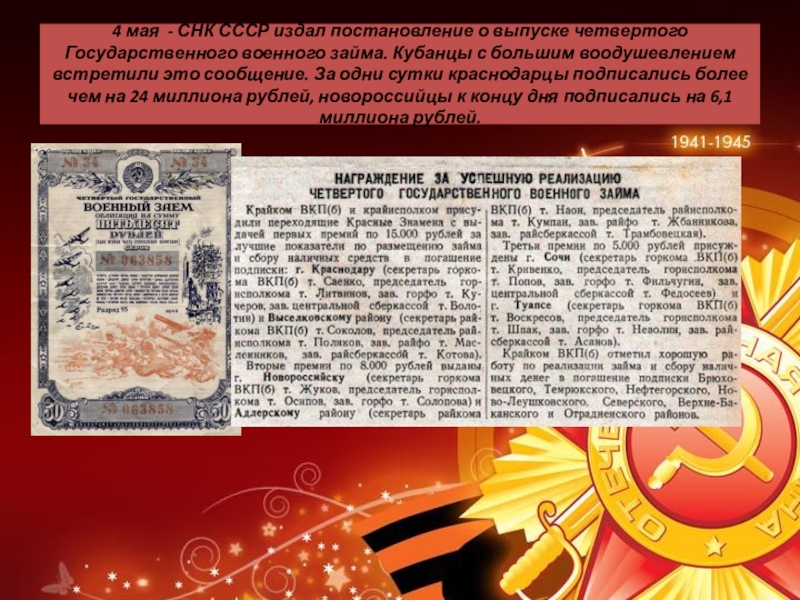 Слайд 254 мая - СНК СССР издал постановление о выпуске четвертого Государственного военного займа. Кубанцы