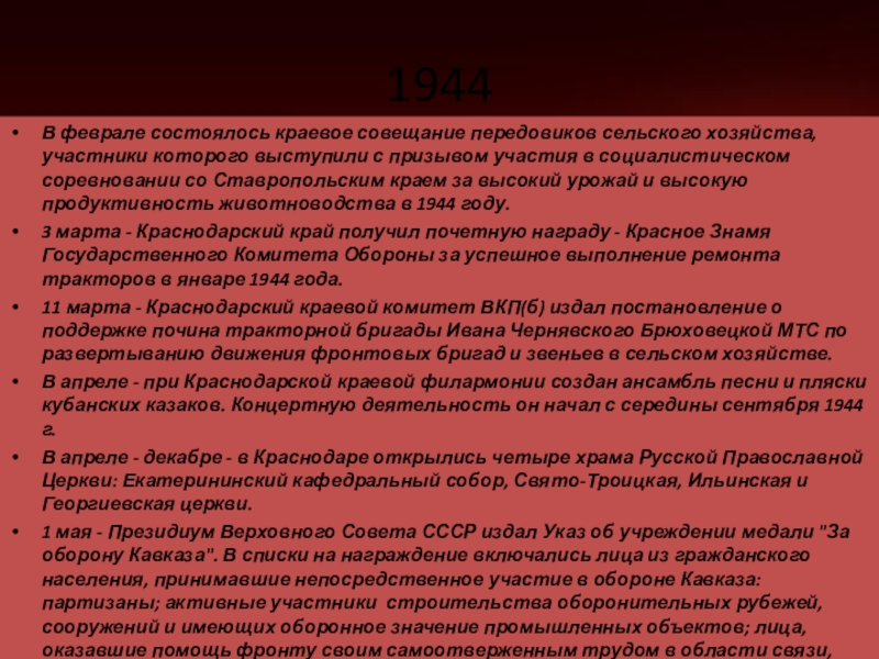 3 марта - Краснодарский край получил почетную награду - Красное Знамя Государственного Комитета Обороны за успешное выполнение ремонта тракторов в январе 1944 года.