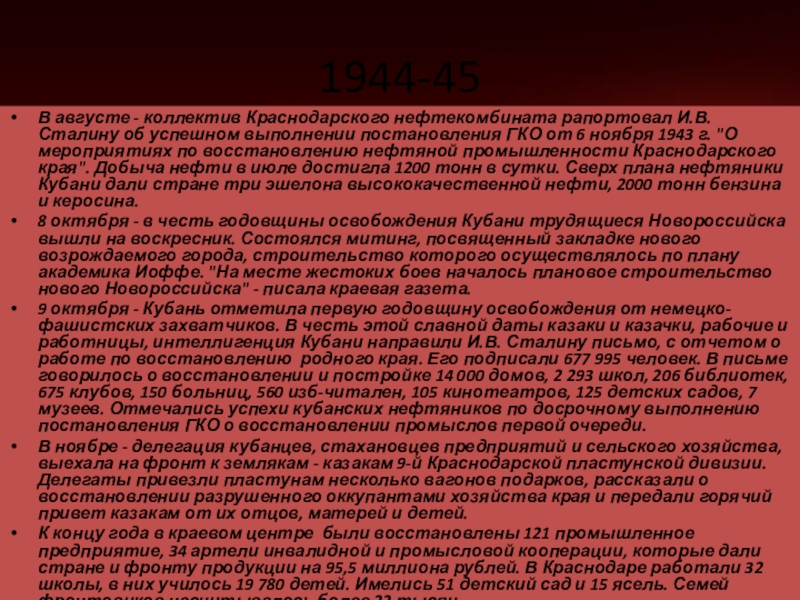 9 октября - Кубань отметила первую годовщину освобождения от немецко-фашистских захватчиков. В честь этой славной даты казаки и казачки, рабочие и работницы, интеллигенция Кубани направили И.В. Сталину письмо, с отчетом о работе по восстановлению родного края. Его подписали 677 995 человек. В письме говорилось о восстановлении и постройке 14 000 домов, 2 293 школ, 206 библиотек, 675 клубов, 150 больниц, 560 изб-читален, 105 кинотеатров, 125 детских садов, 7 музеев. Отмечались успехи кубанских нефтяников по досрочному выполнению постановления ГКО о восстановлении промыслов первой очереди.