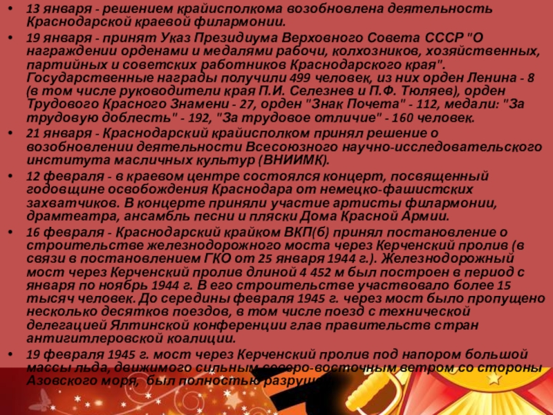 Слайд 1913 января - решением крайисполкома возобновлена деятельность Краснодарской краевой филармонии.