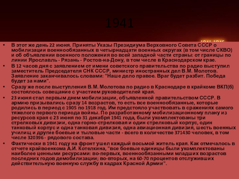 23 июня стал первым днем мобилизации, объявленной правительством СССР. В армию призывались сразу 14 возрастов, то есть все военнообязанные, которые родились в период с 1905 по 1918 год. Им предстояло участвовать в сражениях самого тяжелого первого периода войны. По разработанному мобилизационному плану из ресурсов края с 23 июня по 31 декабря 1941 года, были укомплектованы три стрелковых дивизии, одна горно-стрелковая и один стрелковый корпус, один танковый корпус и одна танковая дивизия, одна авиационная дивизия, шесть военных училищ и другие боевые и тыловые части - всего в количестве 371430 человек, в том числе 320396 - рядового состава.