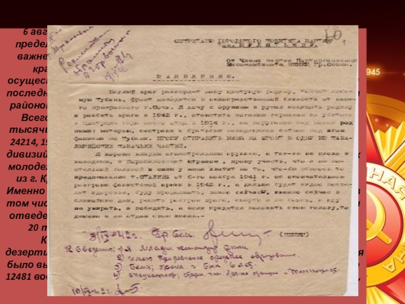 Слайд 126 августа. Начался отвод военнообязанных и призывников из пределов Краснодарского края. Это