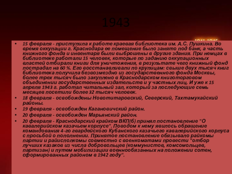 20 февраля - Краснодарский крайком ВКП(б) принял постановление "О кавалерийском казачьем корпусе". Поводом к нему явилось обращение командования 4-го гвардейского Кубанского казачьего кавалерийского корпуса с просьбой о пополнении. Принятое постановление обязывало райкомы партии и райисполкомы совместно с военкоматами провести "отбор лучших казаков из числа добровольцев (коммунистов, комсомольцев, партизан) и путем мобилизации военнообязанных на положении сотен, сформированных районом в 1942 году".