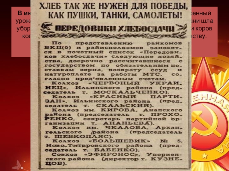 Слайд 21В июле - августе - с призывами "по-фронтовому уберем военный урожай", "убирать