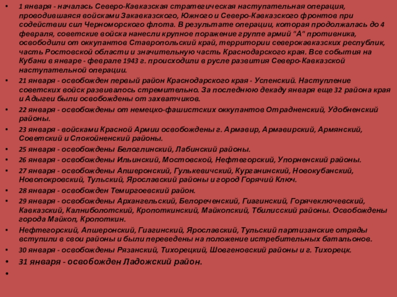 21 января - освобожден первый район Краснодарского края - Успенский. Наступление советских войск развивалось стремительно. За последнюю декаду января еще 32 района края и Адыгеи были освобождены от захватчиков.