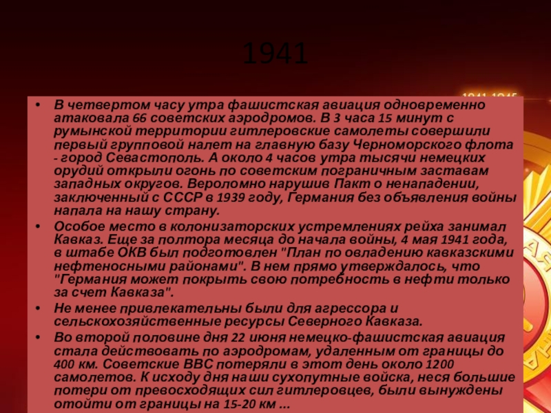 июня. Начало войны. В четвертом часу утра фашистская авиация одновременно атаковала 66 советских аэродромов. В 3 часа 15 минут с румынской территории гитлеровские самолеты совершили первый групповой налет на главную базу Черноморского флота - город Севастополь. А около 4 часов утра тысячи немецких орудий открыли огонь по советским пограничным заставам западных округов. Вероломно нарушив Пакт о ненападении, заключенный с СССР в 1939 году, Германия без объявления войны напала на нашу страну.