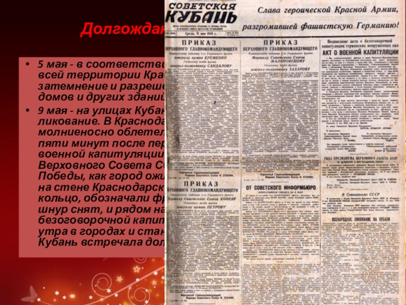 9 мая - на улицах Кубани было поистине всенародное ликование. В Краснодаре радостная весть о победе молниеносно облетела весть город. Прошло не больше пяти минут после первой передачи по радио акта о военной капитуляции Германии и Указа Президиума Верховного Совета СССР об объявлении 9 мая Праздником Победы, как город ожил. Еще накануне на карте, висевшей на стене Краснодарского вокзала, две линии, образующие кольцо, обозначали фронт. Теперь карта была пуста, шнур снят, и рядом на доске появилось сообщение о безоговорочной капитуляции Германии. В начале пятого утра в городах и станицах края прошли первые митинги. Кубань встречала долгожданный День Победы.