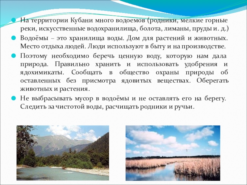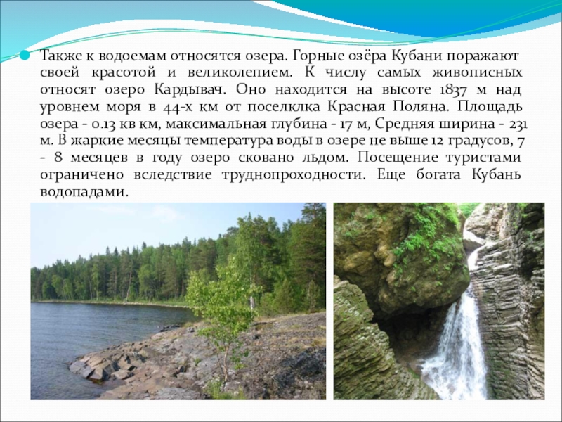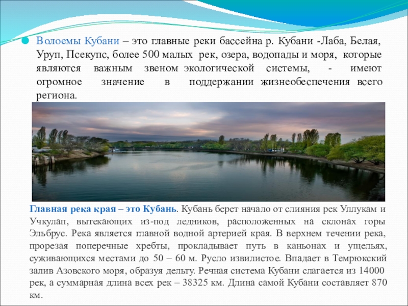 Главная река края – это Кубань. Кубань берет начало от слияния рек Уллукам и Учкулап, вытекающих из-под ледников, расположенных на склонах горы Эльбрус. Река является главной водной артерией края. В верхнем течении река, прорезая поперечные хребты, прокладывает путь в каньонах и ущельях, суживающихся местами до 50 – 60 м. Русло извилистое. Впадает в Темрюкский залив Азовского моря, образуя дельту. Речная система Кубани слагается из 14000 рек, а суммарная длина всех рек – 38325 км. Длина самой Кубани составляет 870 км.