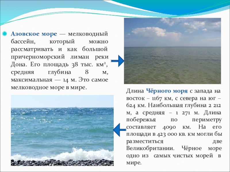 Длина Чёрного моря с запада на восток – 1167 км, с севера на юг – 624 км. Наибольшая глубина 2 212 м, а средняя – 1 271 м. Длина побережья по периметру составляет 4090 км. На его площади в 423 000 кв. км могли бы разместиться две Великобритании. Чёрное море одно из самых чистых морей в мире.