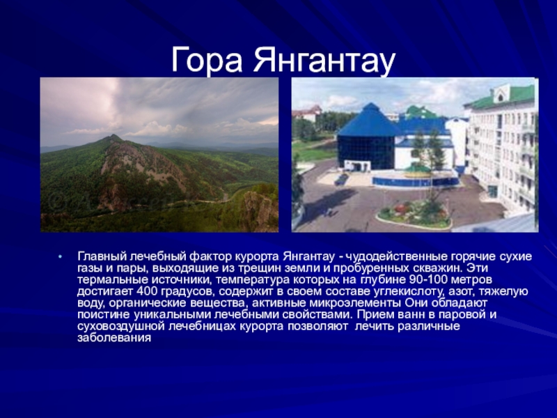 Гора ЯнгантауГлавный лечебный фактор курорта Янгантау - чудодейственные горячие сухие газы и пары, выходящие из трещин земли