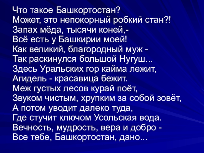 Что такое Башкортостан? Может, это непокорный робкий стан?! Запах мёда, тысячи коней,- Всё есть у Башкирии моей! Как великий, благородный муж - Так раскинулся большой Нугуш... Здесь Уральских гор кайма лежит, Агидель - красавица бежит. Меж