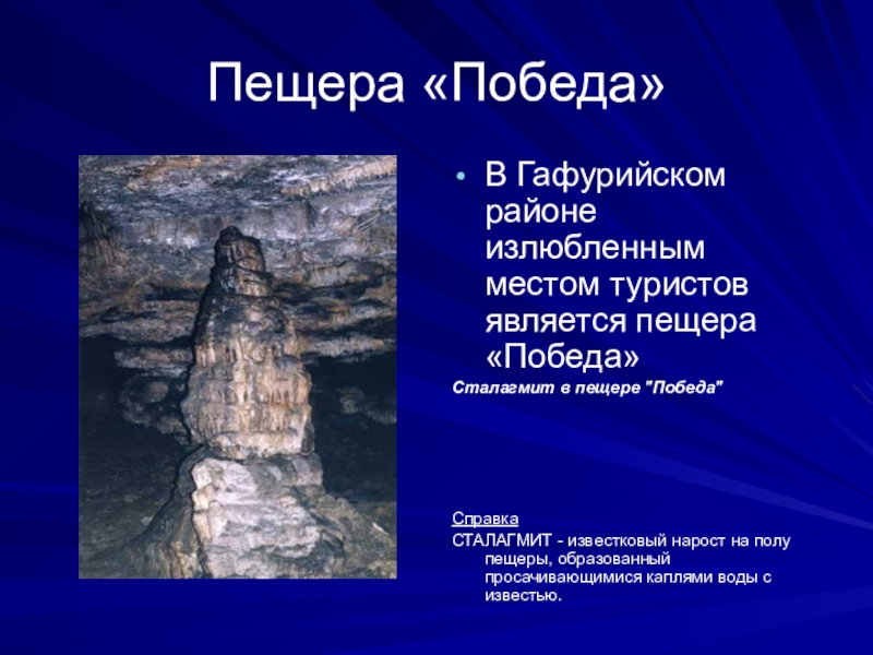 Пещера «Победа»В Гафурийском районе излюбленным местом туристов является пещера «Победа»Сталагмит в пещере