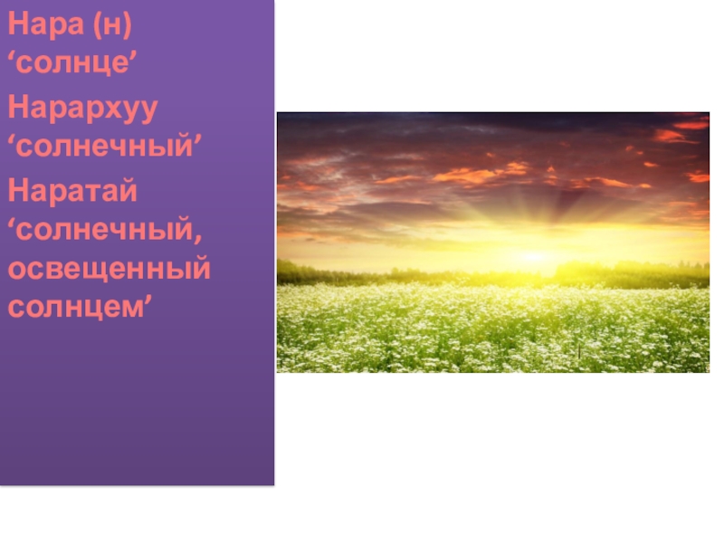Нара (н) ‘солнце’Нарархуу ‘солнечный’Наратай ‘солнечный, освещенный солнцем’