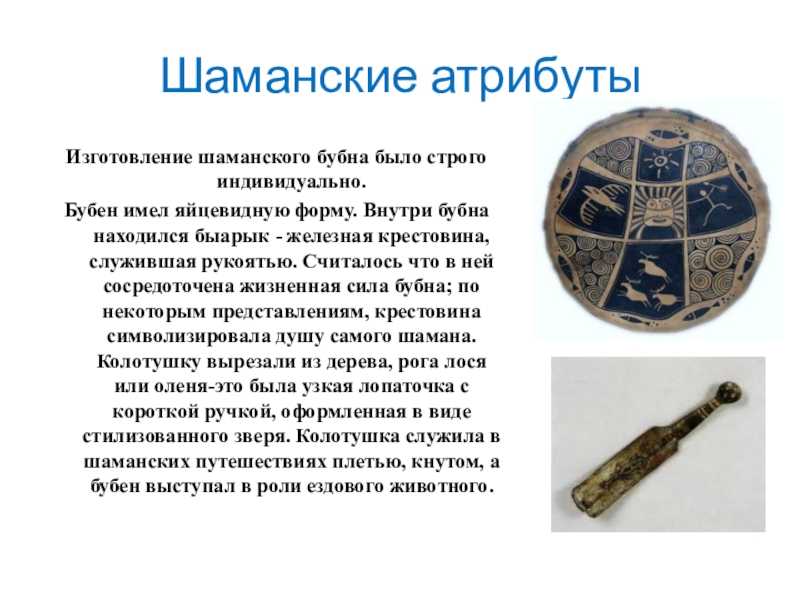 бубна находился быарык - железная крестовина, служившая рукоятью. Считалось что в ней сосредоточена жизненная сила бубна; по некоторым представлениям, крестовина символизировала душу самого шамана. Колотушку вырезали из дерева, рога лося или оленя-это была узкая лопаточка с короткой ручкой, оформленная в виде стилизованного зверя. Колотушка служила в шаманских путешествиях плетью, кнутом, а бубен выступал в роли ездового животного.