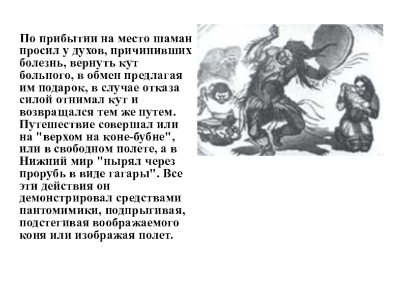 причинивших болезнь, вернуть кут больного, в обмен предлагая им подарок, в случае отказа силой отнимал кут и возвращался тем же путем. Путешествие совершал или на "верхом на коне-бубне", или в свободном полете, а в Нижний мир "нырял через прорубь в виде гагары". Все эти действия он демонстрировал средствами пантомимики, подпрыгивая, подстегивая воображаемого коня или изображая полет.