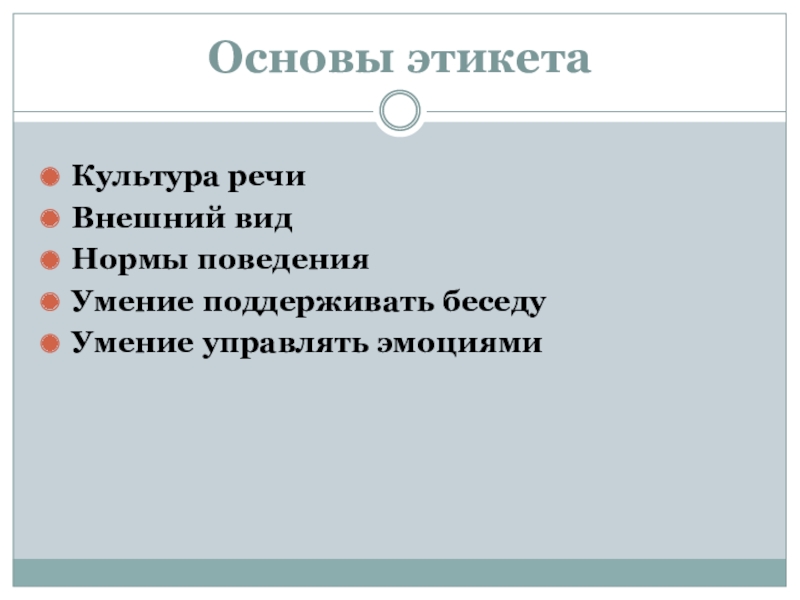 Основы этикетаКультура речиВнешний видНормы поведенияУмение поддерживать беседуУмение управлять эмоциями