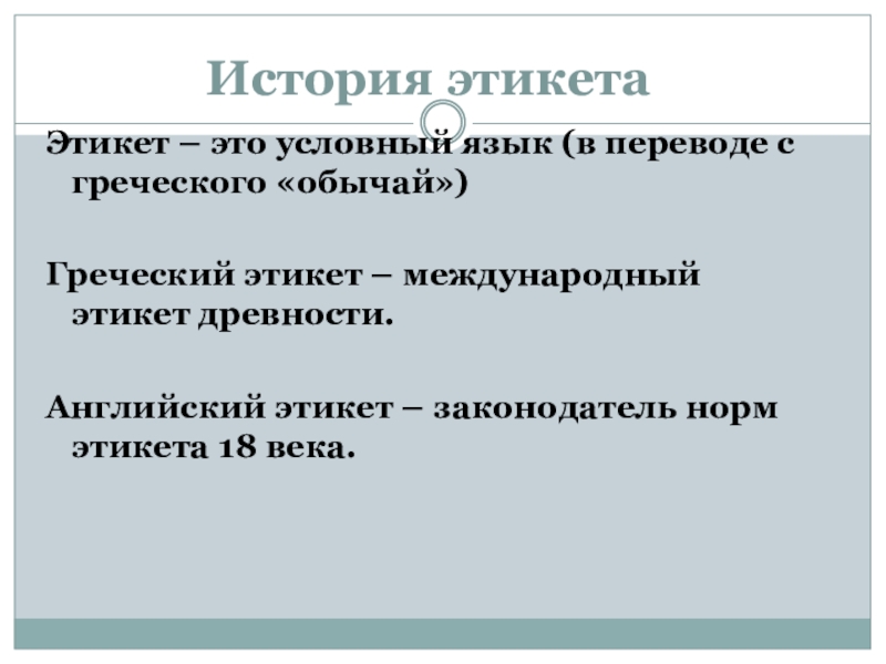 История этикетаЭтикет – это условный язык (в переводе с греческого «обычай»)Греческий этикет – международный этикет древности.Английский этикет