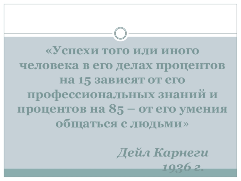 зависят от его профессиональных знаний и процентов на 85 – от его умения общаться с людьми» Дейл Карнеги 1936 г.