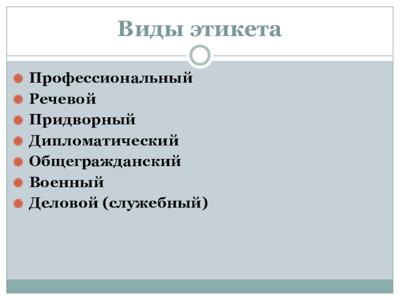 Виды этикетаПрофессиональныйРечевойПридворныйДипломатическийОбщегражданскийВоенныйДеловой (служебный)