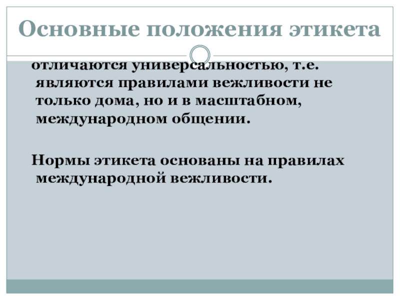 Основные положения этикета отличаются универсальностью, т.е. являются правилами вежливости не только дома, но и в масштабном, международном