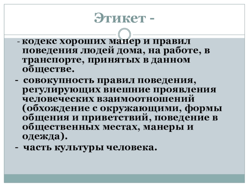 Этикет - - кодекс хороших манер и правил поведения людей дома, на работе, в транспорте, принятых в данном обществе.- совокупность правил поведения, регулирующих внешние проявления человеческих взаимоотношений (обхождение с окружающими, формы общения и приветствий, поведение в