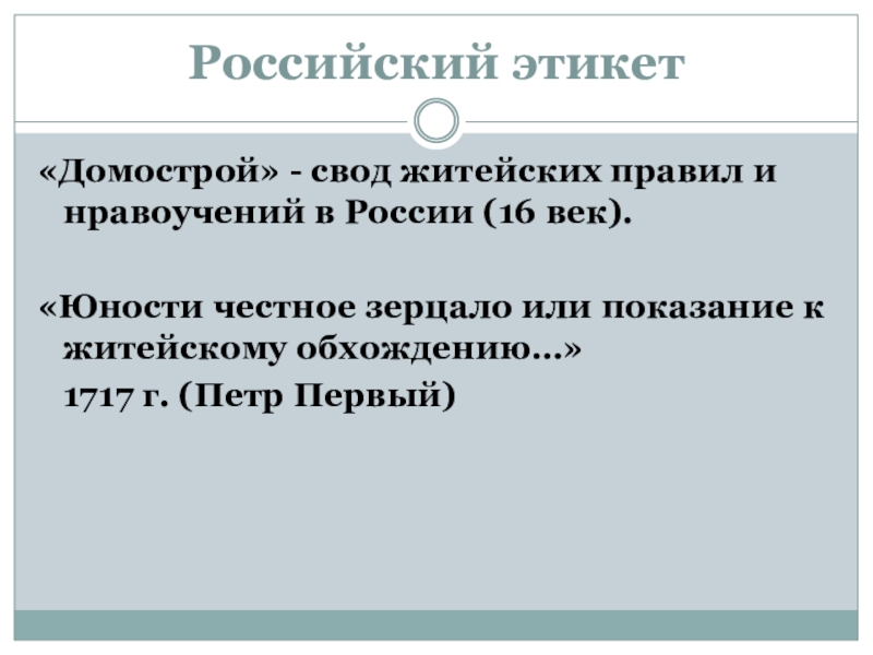 Российский этикет«Домострой» - свод житейских правил и нравоучений в России (16 век).«Юности честное зерцало или показание к