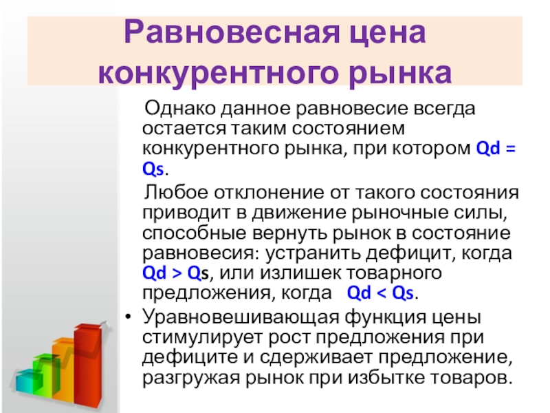 Любое отклонение от такого состояния приводит в движение рыночные силы, способные вернуть рынок в состояние равновесия: устранить дефицит, когда Qd > Qs, или излишек товарного предложения, когда Qd < Qs.
