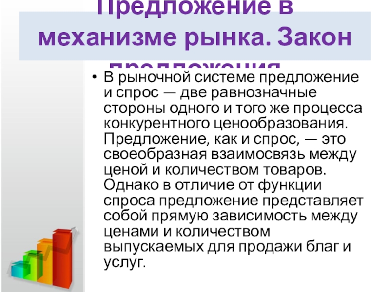 — две равнозначные стороны одного и того же процесса конкурентного ценообразования. Предложение, как и спрос, — это своеобразная взаимосвязь между ценой и количеством товаров. Однако в отличие от функции спроса предложение представляет собой прямую зависимость между ценами и количеством выпускаемых для продажи благ и услуг.