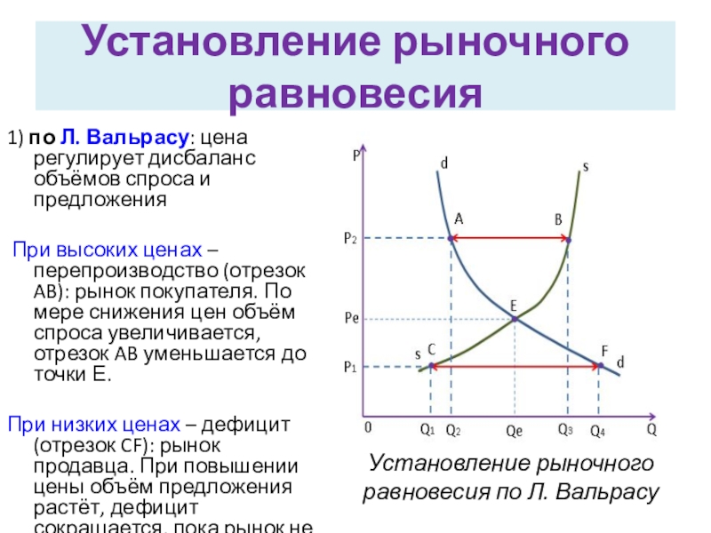 1) по Л. Вальрасу: цена регулирует дисбаланс объёмов спроса
