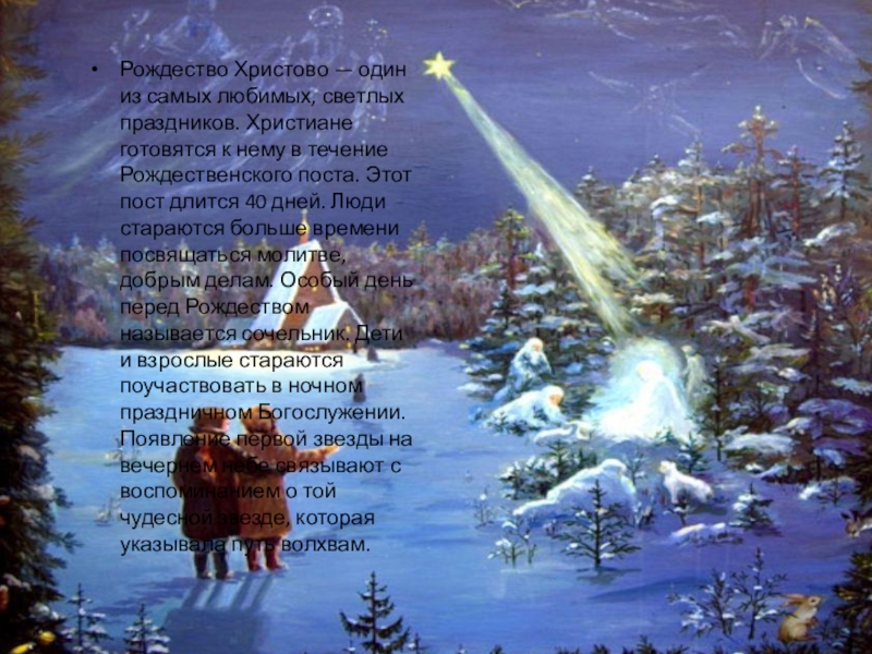 к нему в течение Рождественского поста. Этот пост длится 40 дней. Люди стараются больше времени посвящаться молитве, добрым делам. Особый день перед Рождеством называется сочельник. Дети и взрослые стараются поучаствовать в ночном праздничном Богослужении. Появление первой звезды на вечернем небе связывают с воспоминанием о той чудесной звезде, которая указывала путь волхвам.