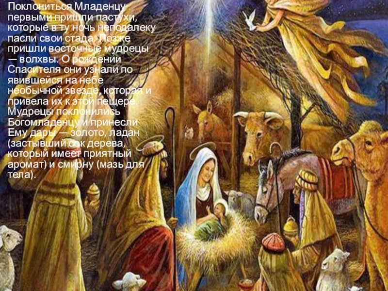 свои стада. Позже пришли восточные мудрецы — волхвы. О рождении Спасителя они узнали по явившейся на небе необычной звезде, которая и привела их к этой пещере. Мудрецы поклонились Богомладенцу и принесли Ему дары — золото, ладан (застывший сок дерева, который имеет приятный аромат) и смирну (мазь для тела).