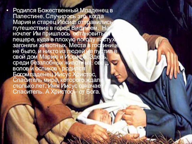 Иосиф отправились в путешествие в город Вифлеем. На ночлег Им пришлось остановиться в пещере, куда в плохую погоду пастухи загоняли животных. Места в гостинице не было, и никто из людей не пустил в свой дом Марию и Иосифа. Здесь, среди беззлобных животных: овец, волов и осликов - родился Богомладенец Иисус Христос, Спаситель мира, которого ждали столько лет. Имя Иисус означает Спаситель. А Христос – от Бога.