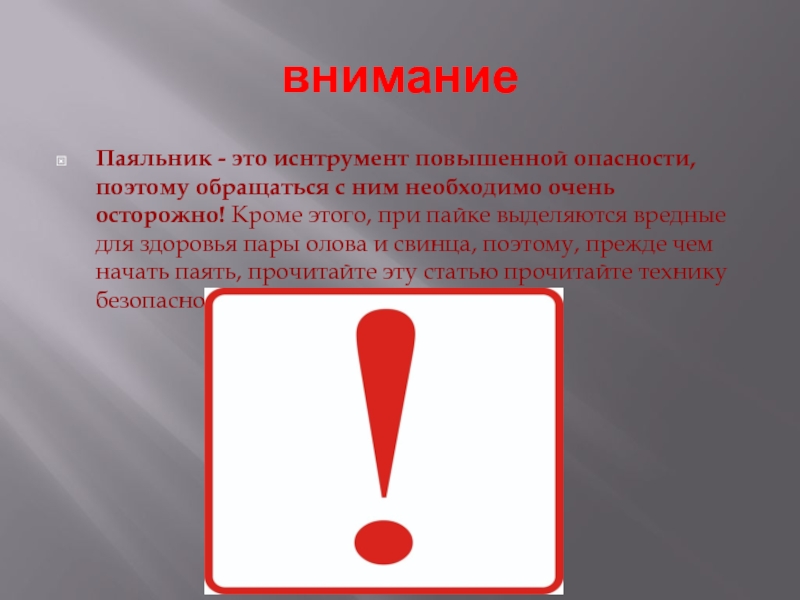 вниманиеПаяльник - это иснтрумент повышенной опасности, поэтому обращаться с ним необходимо очень осторожно! Кроме этого, при пайке выделяются