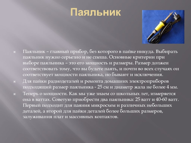 Паяльник Паяльник – главный прибор, без которого в пайке никуда. Выбирать паяльник нужно серьезно и не спеша. Основные критерии при выборе паяльника – это его мощность и размеры. Размер должен соответствовать тому, что вы будете паять,