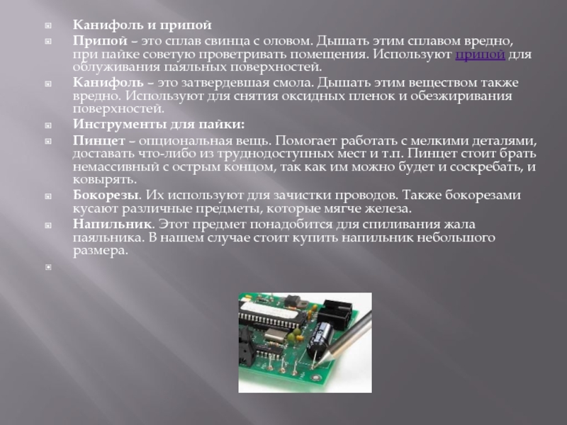 Канифоль и припойПрипой – это сплав свинца с оловом. Дышать этим сплавом вредно, при пайке советую проветривать помещения.