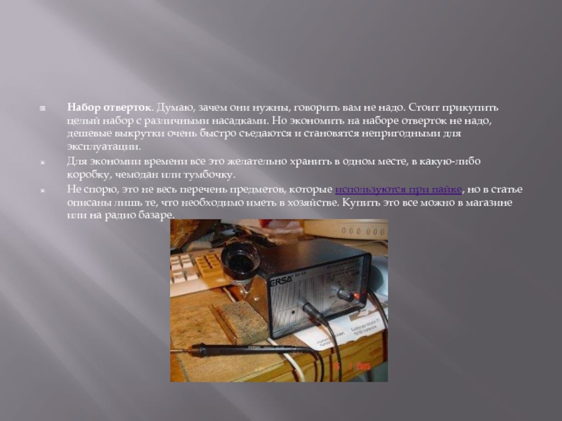 Слайд 5Набор отверток. Думаю, зачем они нужны, говорить вам не надо. Стоит