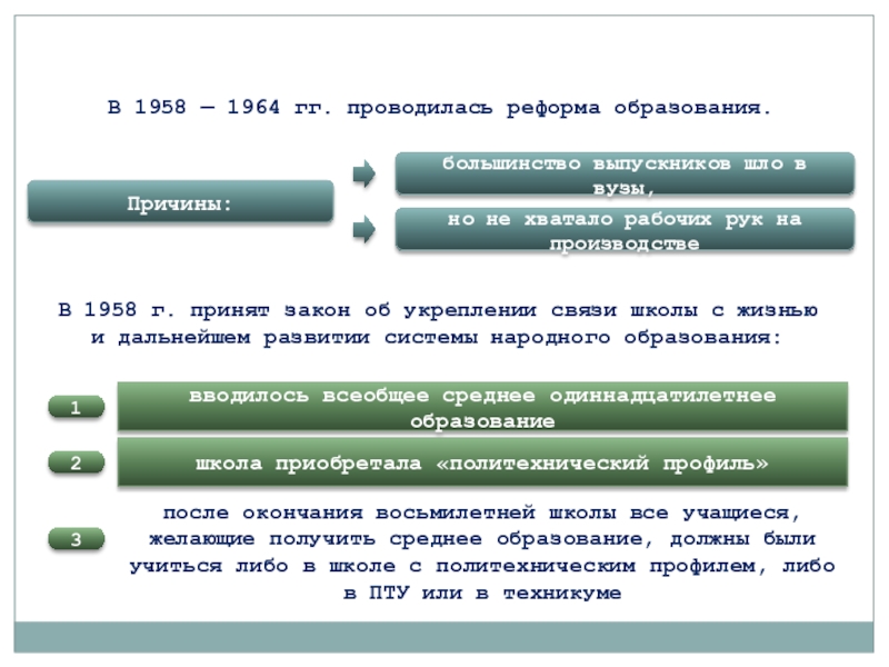 В 1958 г. принят закон об укреплении связи школы с жизнью и дальнейшем развитии системы народного образования: