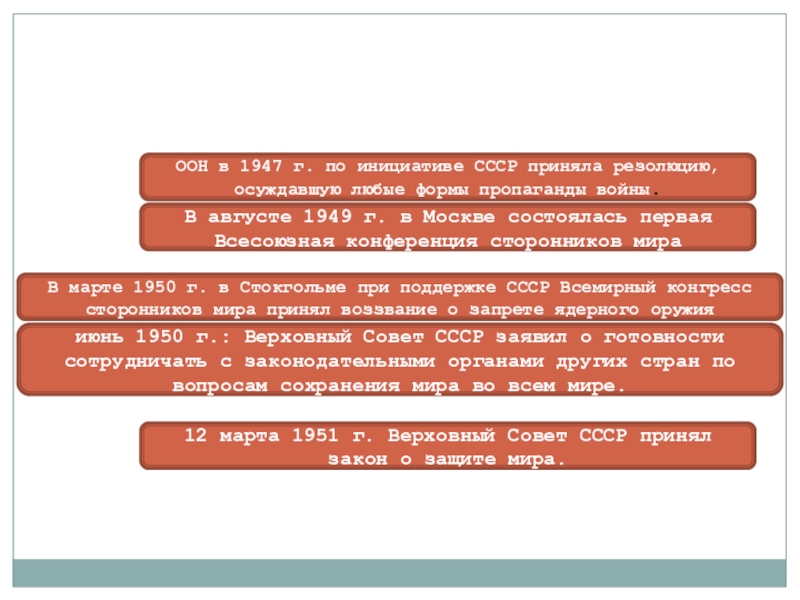 июнь 1950 г.: Верховный Совет СССР заявил о готовности сотрудничать с законодательными органами других стран по вопросам сохранения мира во всем мире.