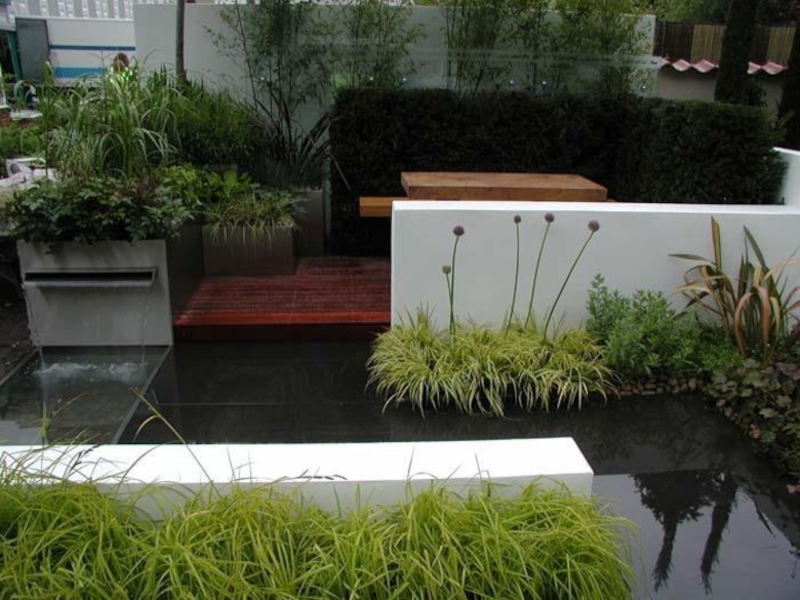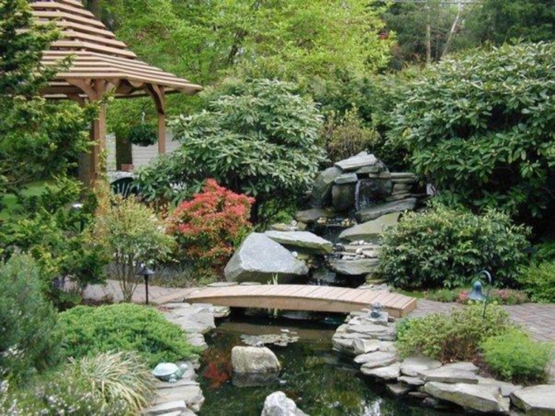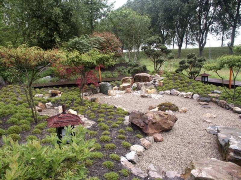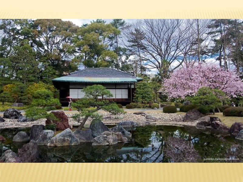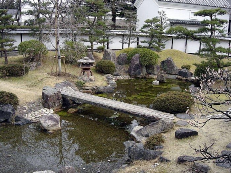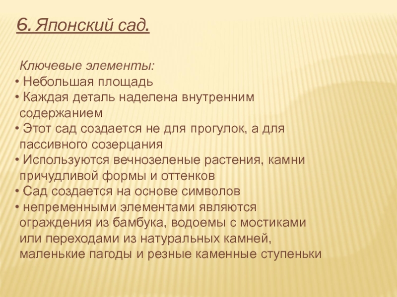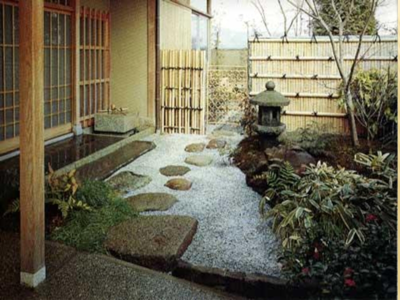 непременными элементами являются ограждения из бамбука, водоемы с мостиками или переходами из натуральных камней, маленькие пагоды и резные каменные ступеньки