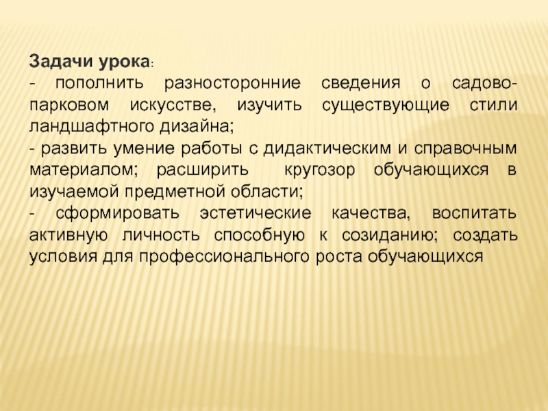 - пополнить разносторонние сведения о садово-парковом искусстве, изучить существующие