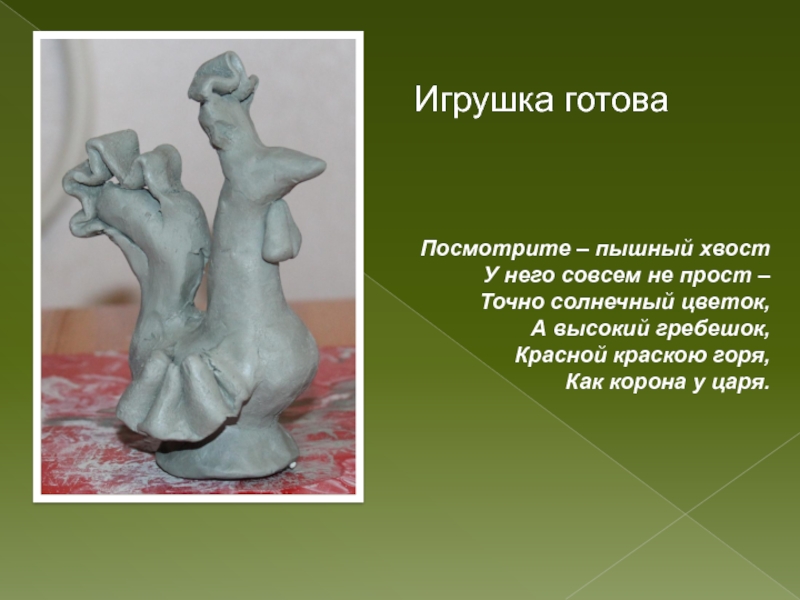 Игрушка готоваПосмотрите – пышный хвост	У него совсем не прост – 	Точно солнечный цветок,	А высокий гребешок,	Красной краскою горя,	Как
