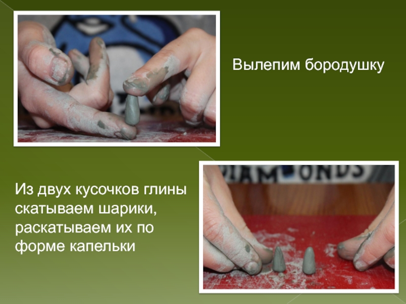 Из двух кусочков глины скатываем шарики, раскатываем их по форме капелькиВылепим бородушку