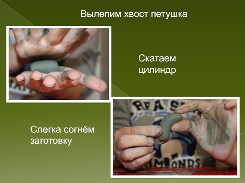 Вылепим хвост петушкаСкатаем цилиндрСлегка согнём заготовку