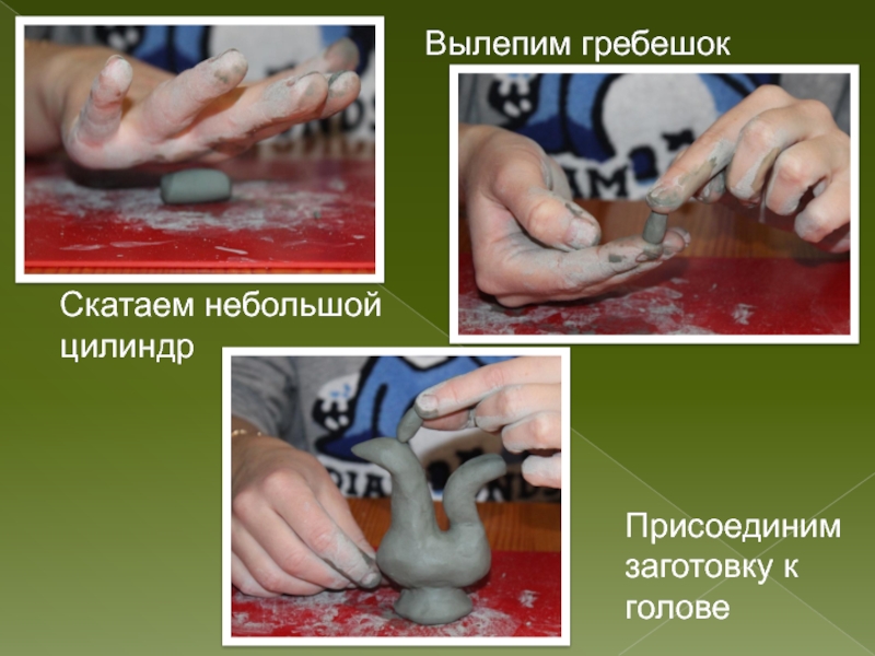 Вылепим гребешокСкатаем небольшой цилиндр Присоединим заготовку к голове