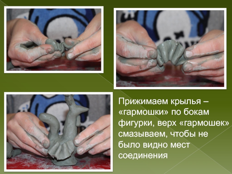 Слайд 17Прижимаем крылья –«гармошки» по бокам фигурки, верх «гармошек» смазываем, чтобы не